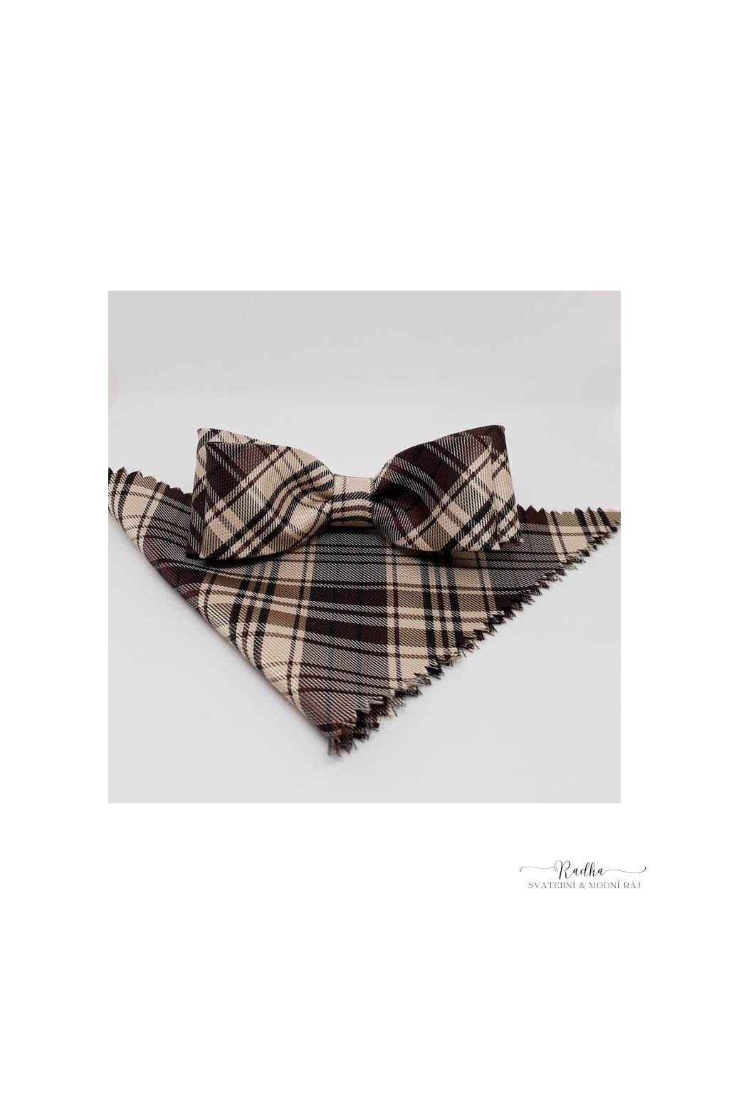 Pánský dvojitý motýlek s kapesníčkem. Ke krku se uchytí elegantním zapínáním s možností nastavení správné délky. Velikost cca 10 cm. Dodáván s kapesníčkem v plastové krabičce.