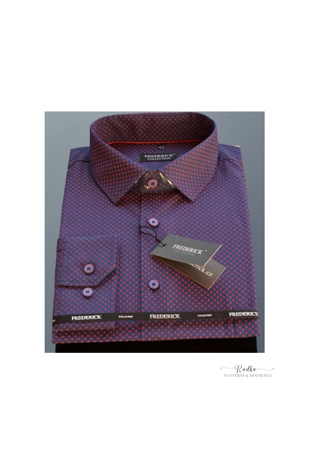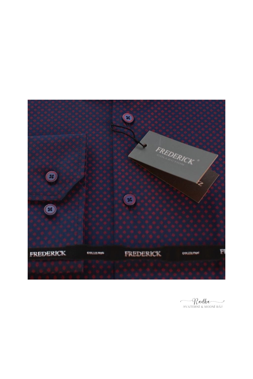 Elegantní pánská košile tmavě modrá s jemným vzorem v červené barvě. Tato košile je vhodná do obleku ale také bude skvěle vypadat k jeans kalhotám...