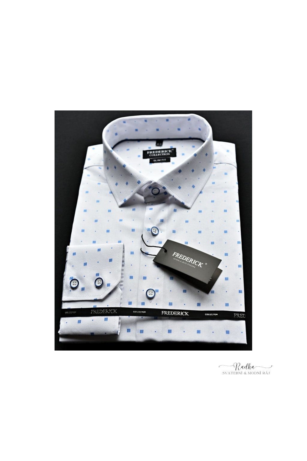 Pánská košile s dlouhým rukávem bílé barvy s elegantním vzorem modré barvy. Knoflíky košile jsou moderního tvaru bílé barvy s modrým okrajem. Elegantní, pohodlná pánská košile s dlouhým rukávem s příjemným vzorem z velmi kvalitního materiálů, je vhodná pro všechny příležitosti.