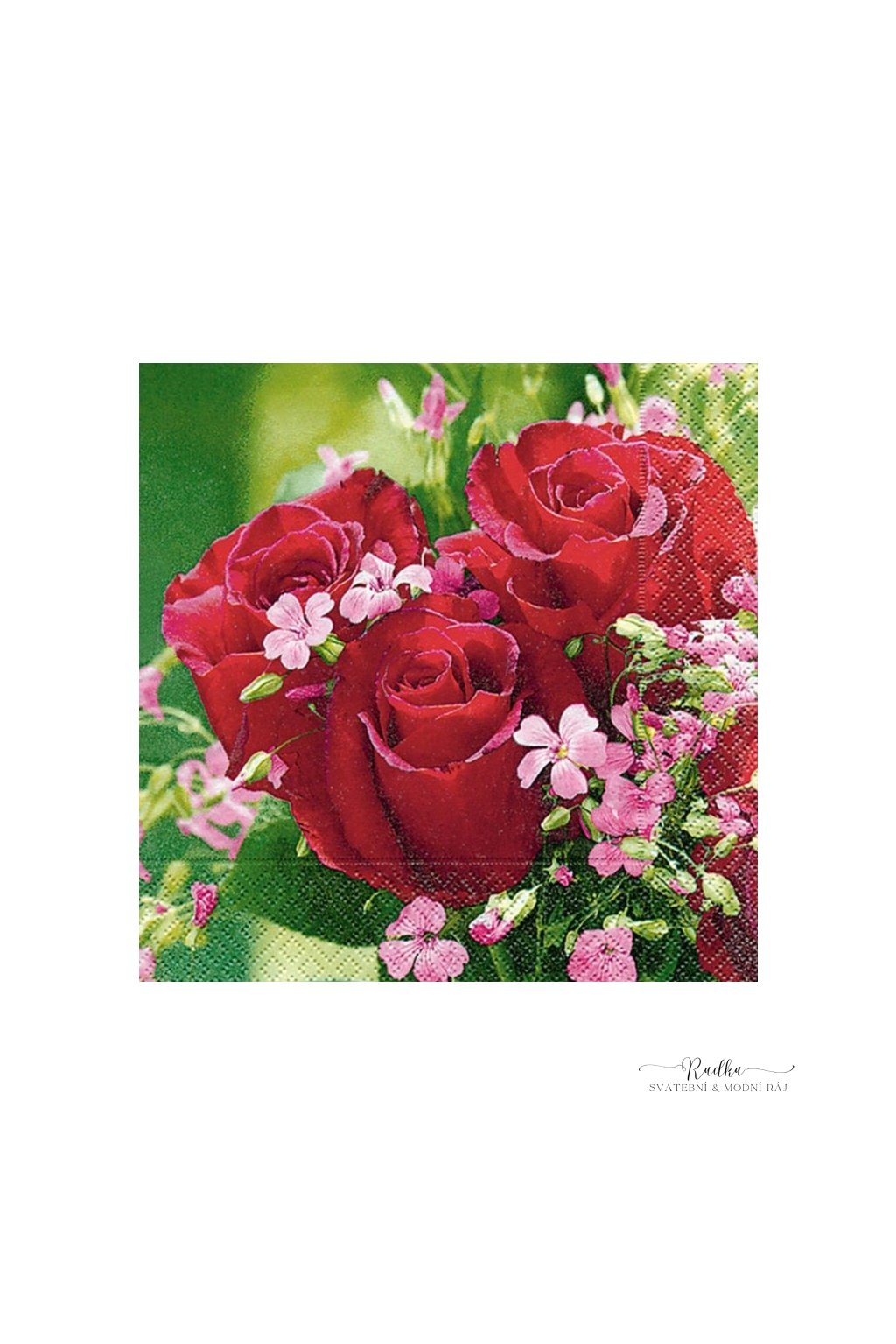 Svatební papírové ubrousky s motivem kytice červených růží s lučním kvítím.
