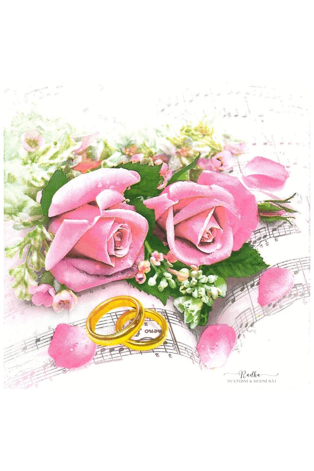 Svatební papírové ubrousky, vzor svatební prsteny s pink růžemi.